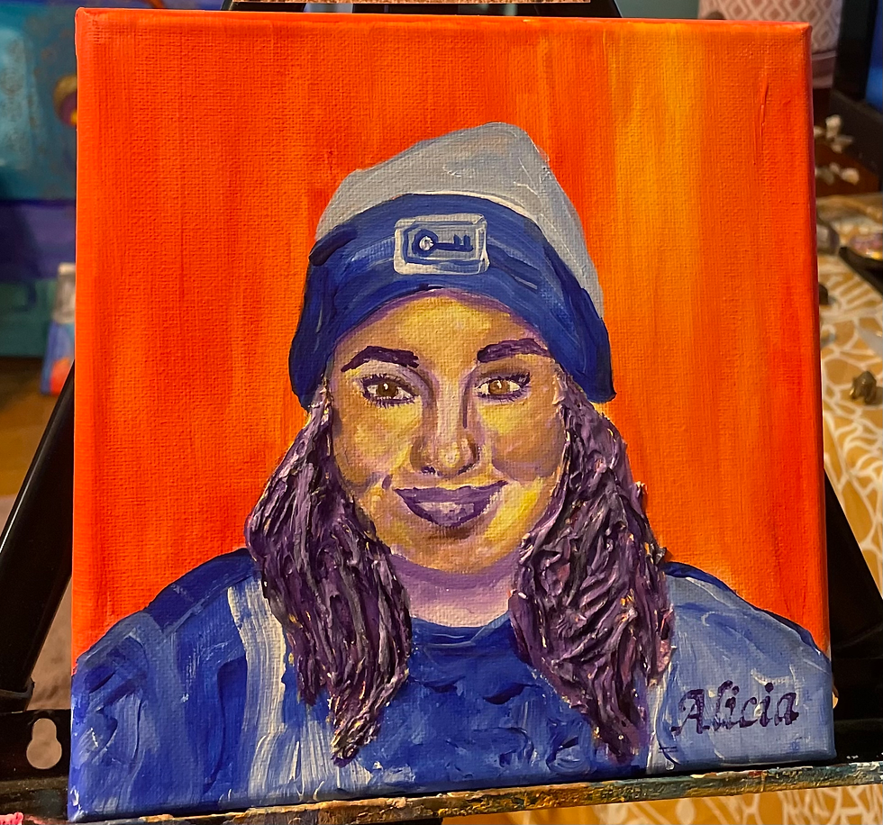Description: Let's just say I have really weird intuition sometimes. I painted this picture one day after I got out of the mental hospital. I had painted my hair purple for fun. I always wanted to dye my hair a wild color, but was nervous. Lets just say about a month later I had purple hair. This piece is titled key to change because I believe the hospital started a whole new life for me. It sent me on this journey of creating art for myself, to help process and heal. The key on my hat represents the gift I received at the end of my hospital journey. It's the key to my own success. I carry around they key with me still to remind myself how far I have come and its just the beginning of my new outlook on life.